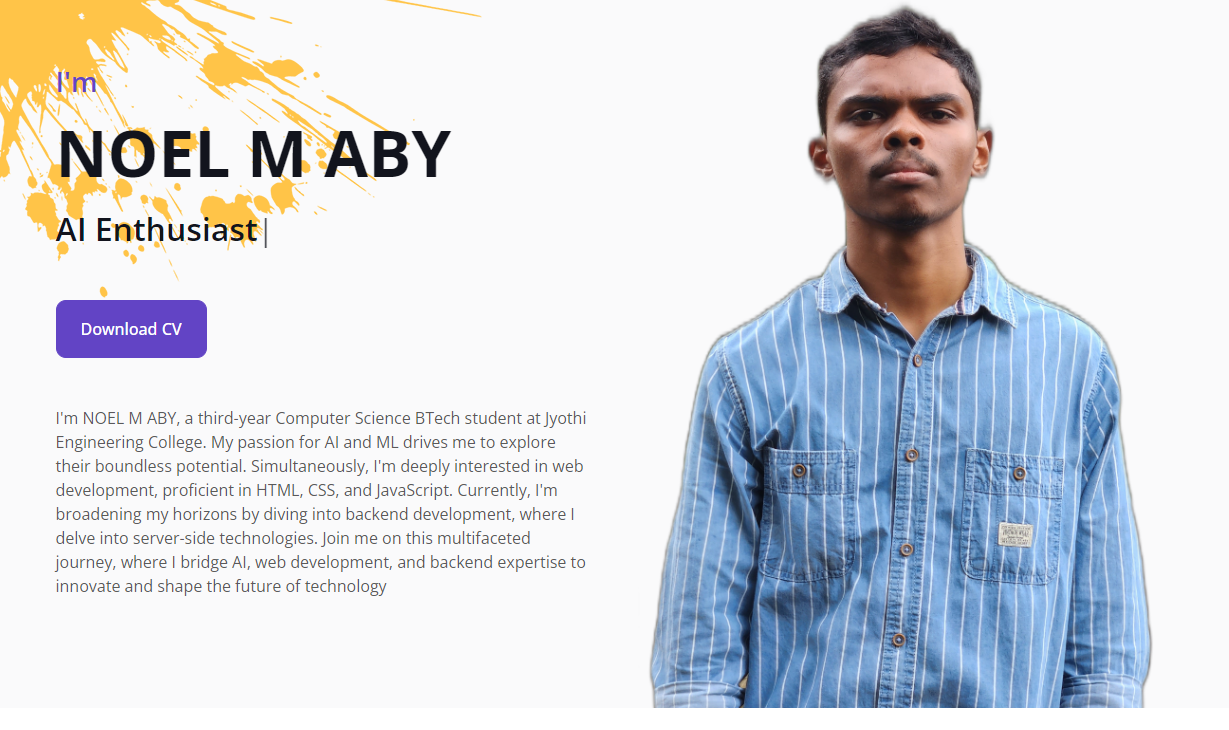 I'm NOEL M ABY, a third-year Computer Science BTech student at Jyothi Engineering College. My passion for AI and ML drives me to explore their boundless potential. Simultaneously, I'm deeply interested in web development, proficient in HTML, CSS, and JavaScript. Currently, I'm broadening my horizons by diving into backend development, where I delve into server-side technologies. Join me on this multifaceted journey, where I bridge AI, web development, and backend expertise to innovate and shape the future of technology